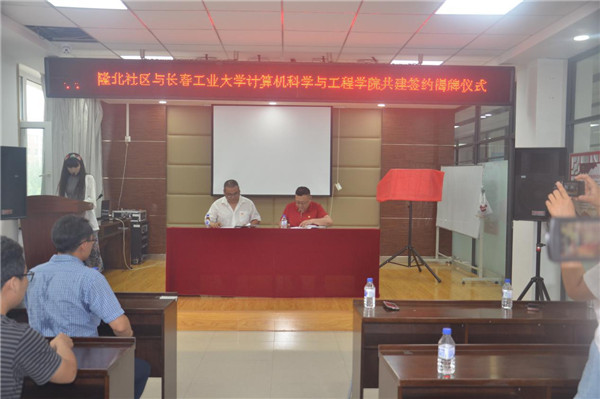 与长春市北湖街道隆北社区关于建立大学生社会实践基地协议书》,党委副书记季宏伟与房希明共同为社会实践基地揭牌。