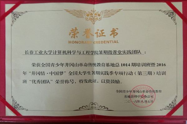 社会实践队荣获全国青少年井冈山革命传统教育基地总1014期培训班暨2016年“井冈情,中国梦”全国大学生暑期实践季专项行动(第三期)培训班“优秀团队”荣誉称号,其中,王珺楠老师还荣获“优秀带队教师”称号。