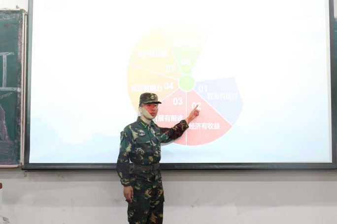 此次会议由张一博教官主讲。首先,张一博教官对同学们最为关心的征兵政策做了详细的解释说明。他从政治优待、经济收益、发展前途、就业助力、学业保障、创业扶持六个方面讲述了参军入伍给同学们带来的帮助与收益。随后,他又向同学们介绍了征兵工作的征兵对象、身体条件等情况。会场气氛非常热烈,同学们接连向张一博教官抛出问题。随后张一博教官对多数同学提出的学费减免、落户要求、助学复学等问题做了统一解答。最后,他阐述了大学生征兵入伍对自身塑造和锻炼成才的重要意义,并期望同学们积极参与应征入伍。接下来,任时瑶教官对张一博教官的讲话进行了补充。他详细的说明了征兵入伍的时间,并对参军入伍优惠政策做了实例化解释。