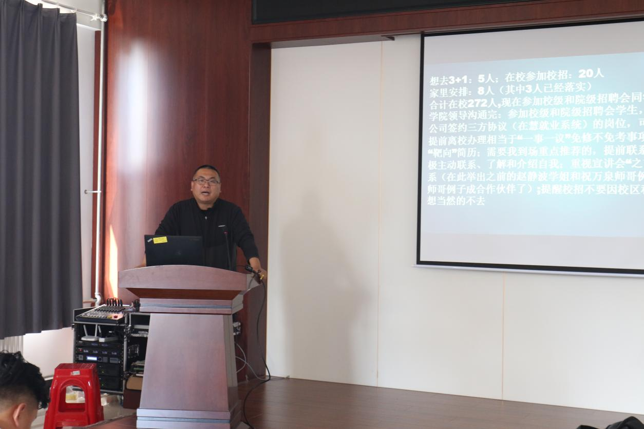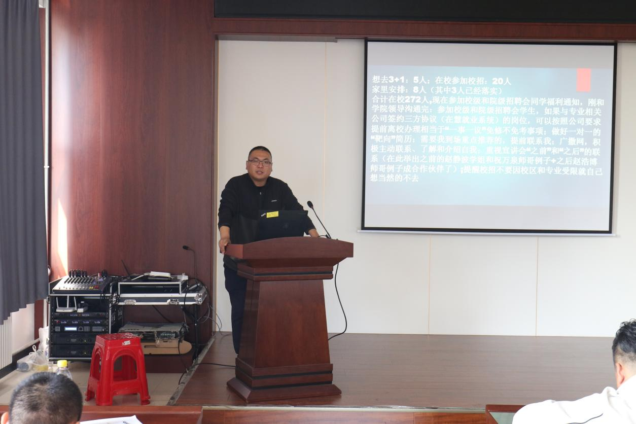 会议伊始,王珺楠老师就当今就业形势向同学们进行了详细的讲解,针对目前大学生就业形势也做出了具体的分析。其次,他提出“迈开腿,张开嘴”的行动思维,提醒广大同学不要受专业限制、校区限制,一定积极参加秋招。而后,针对考研以及考公务员的事项进行说明指导。向同学们介绍了长春工业大学就业信息网,提醒同学提前做好“靶向”简历。在为同学们介绍就业工作准备时,他特别强调了签约流程,并且提醒同学们除了应当具备专业知识何能力以外,还应当具有良好的心理素质和一定的求职技巧。最后他对学业预警的相关文件进行了说明。