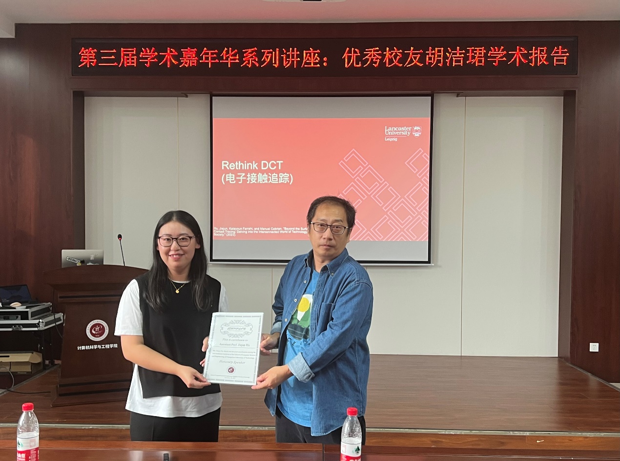 开展庆祝建院45周年暨第三届“学术嘉年华”系列讲座。本次讲座的特邀嘉宾胡洁珺是我校的优秀校友,目前在兰卡斯特大学莱比锡分校担任助理教授,这也是她第二次回母校做学术报告,主题是“Beyond the Surface of Digital Contact Tracing: Delving into the Interconnected World of Technology, Individuals, and Society”。讲座由副院长鲁慧民主持,6合彩开奖