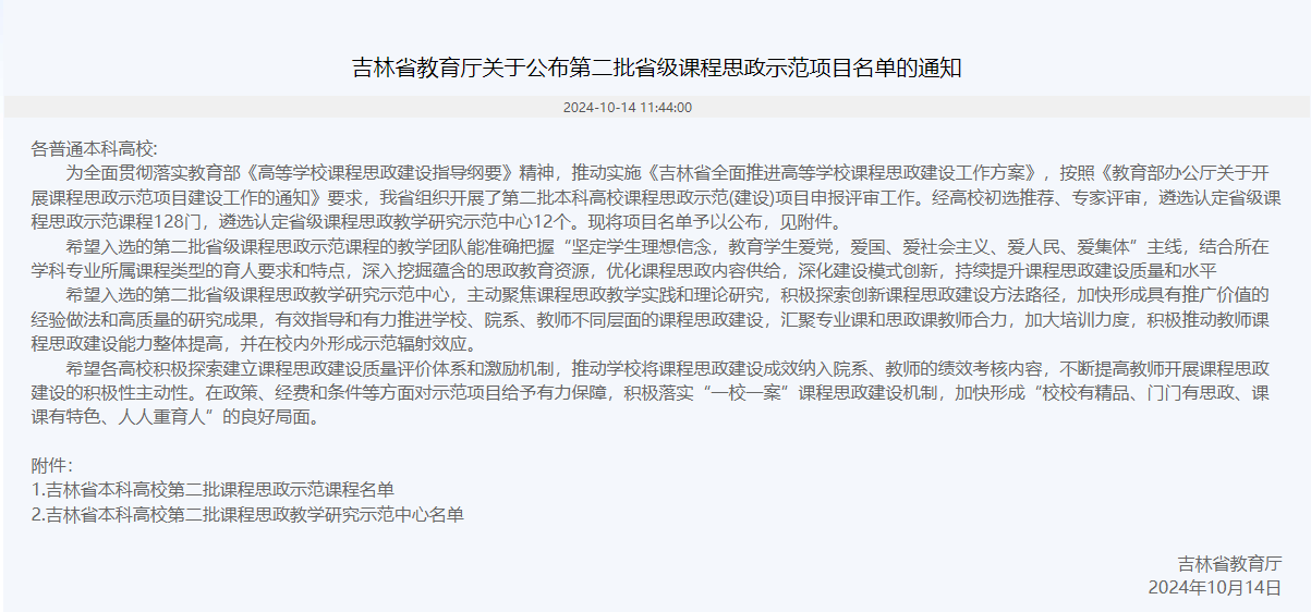 本网讯(通讯员 郑安)2024年10月17日,吉林省教育厅公布了第二批课程思政示范课程认定结果,6合彩开奖