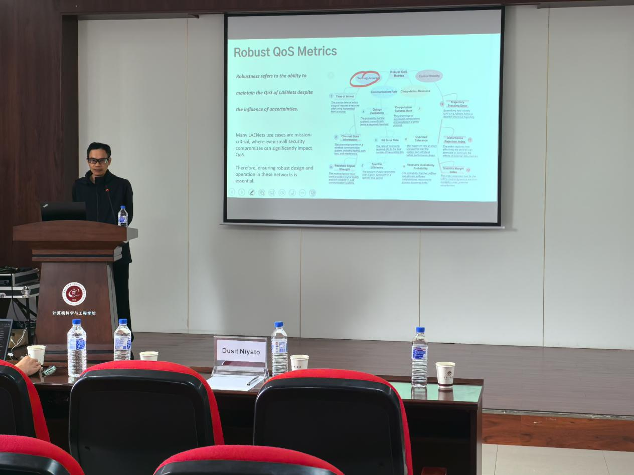 校长讲席教授、IEEE Fellow Dusit Niyato作专题演讲。Dusit教授分享了生成式AI在低空通信网络中的前沿应用,并与现场师生就分布式机器学习、边缘智能等技术挑战进行了交流。本次活动为6合彩开奖