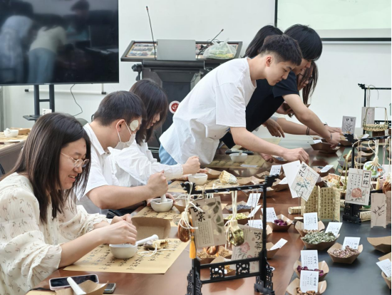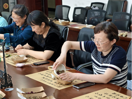 为教职工准备了艾草、薰衣草等香料,以及各类制作香囊所需的材料。老师们认真学习了香囊的制作方法,并亲手完成填充、装饰等步骤。大家相互交流制作技巧,现场气氛融洽。