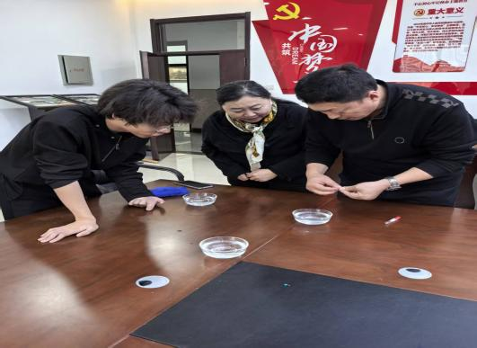 清碗盛露,纤针映光,一场指尖与水的温柔邂逅悄然开启。一分钟的时光里,每一次抬手、每一次投掷,都是耐心与巧劲的完美融合。针尖轻触水面,若能挣脱重力的束缚,将缝衣针摆成三角形,那就是成功。老师们在水与针的低语中,感受传统民俗乞巧的雅致与趣味。
