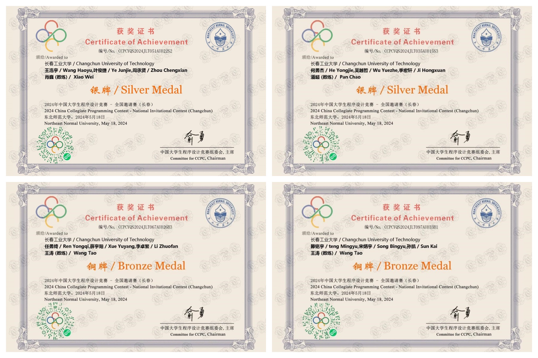 ACM实验室组建了由王涛教授、肖巍副教授指导的6支参赛队伍,18名同学获得佳绩:荣获吉林省大学生程序设计竞赛银牌2项、铜牌2项,优胜奖2项。