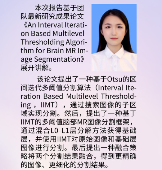 “后起之秀”——An Interval Iteration Based Multilevel Thresholding Algorithm for Brain MR Image Segmentation 主讲人:刘婉如 时间:2021年11月5日 13:30 |