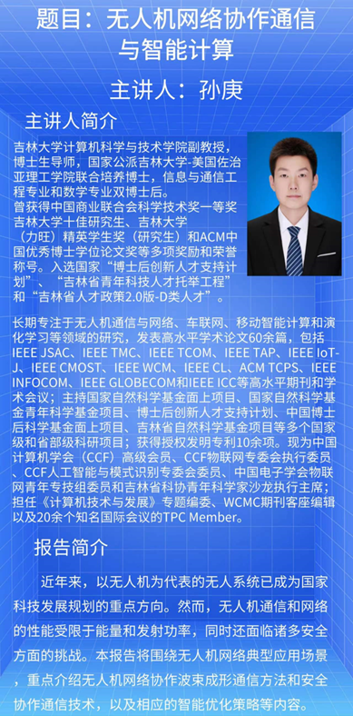 “登高博见” —— 无人机网络协作通信与智能计算 主讲人:孙庚 时间:2022年11月23日 14:30 地点:计算机楼323